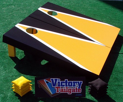 Hi, I assume you're here because you're looking for a discounted Yellow & Black Custom Painted Cornhole Bag Toss Game Set. I know it looks awesome !
